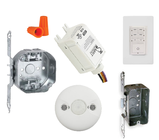 The SMRT Contractor Kit is truly an all in one solution. As a Distributor, you have everything that your contractor needs, in one box. No more of your time is required thumbing through catalogs, or scrolling through web pages to find sensors that match and will work with a power pack and will work with a wall switch. We've done all of that for you, and its all in one box. Ready to go, ready to be installed. As a contractor, you dont need to pick up junction boxes for your power pack and sensors, we put them right in the box for you. Did you run out of orange wire nuts? No problem, they are in the kit as well. And did you really think we'd send you a wireless wall switch without batteries? The batteries are in the kit too, if you pick up the wireless kit. It's truly grab n go.